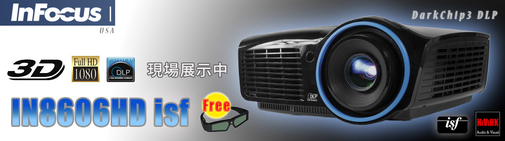 InFocus IN8606HD 全高清家庭影院3D投影機 闊別了家庭影院市場一段時間的美國投影機老牌子 InFocus, 現在捲土重來, 廠方計劃推出一系列高質素的家庭影院投影機, 而打響頭炮就是這部全高清 IN8606HD 3D Projector. InFocus 用了兩年時間來研發這部擁有極高性價比的 IN8606HD, 鏡頭採用了1.5X 大倍率變焦設計, 投影距離比以往縮短及彈性許多, 勢必進佔入門至中階的家庭影院市場. IN8606HD 使用現今最主流的 DLP 投影技術, 高畫質 DarkChip 3芯片,支援 Native 3D 及 Nvidia 3D, Full HD 1080P全高清解像度, 影像處理器更可作專業調校, 是少數能獲取 ISF 認證的入門級家庭投影機!